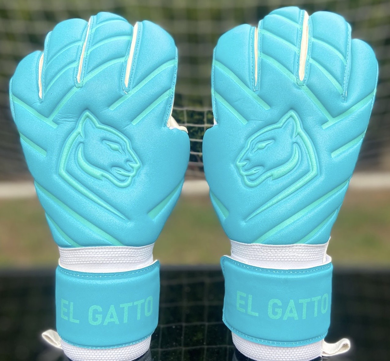 With a sleek aqua and white design, these gloves are fresh, clean and fierce on the pitch.